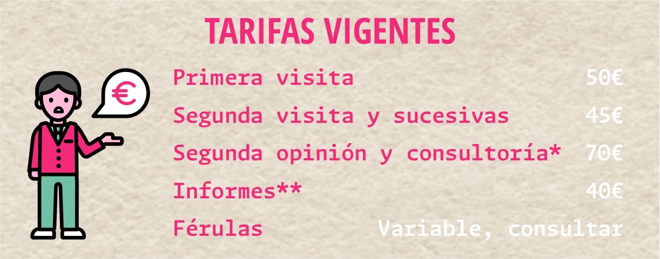 El coste de las férulas, en caso de que necesites una, varía en función del tamaño y la complejidad de su confección (desde las más baratas, los anillos de termoplástico para escaladores, hasta las dinámicas de dedos o muñeca). En caso de que la necesites te explicaremos las ventajas de cada una, o si es preferible que compres alguna por tu cuenta.